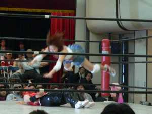 ベイダーアタックの3連発、コーナー2段目からのボディプレス。