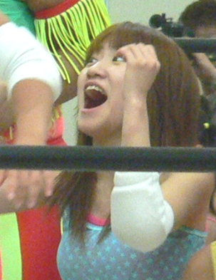 舞組のサブリーダー兼我闘姑娘広報でもあるハルヒ−こと春日萌花は、デビュー以降 いまだ未勝利のレスラー。 中学生とのデビュー戦を皮切りに高校生・小学生と立て続け に敗れ、前人未到の学生3冠を達成した。しかし、ただ可愛く弱いだけのレスラーとは思 えない。ベイダ−アタックという軽量を全く生かせない技の選択、「行くぞ〜」と叫んでか らの逆さ押さえ込み、たっぷりと四方にアピールしてからのその場飛びボディプレスと、 基本的にはトホホではあるものの妙にプロレスファンのツボに入るアクションの連続で、 実は物凄いプロレス頭を持っている人なのではないかと思えてしまうサムシングがある。 また、入場式でくしゃみを連発するなど、彼女の元には笑いの神が降りてくる事も多い。 もちろん、このままでいいというわけではもちろんなく、もっともっと強くなって欲しいのは 確かなのだが…初勝利を目撃する際には、喜びとともに大記録と一つの時代が終わる 寂しさにも襲われそうな予感がする。 |