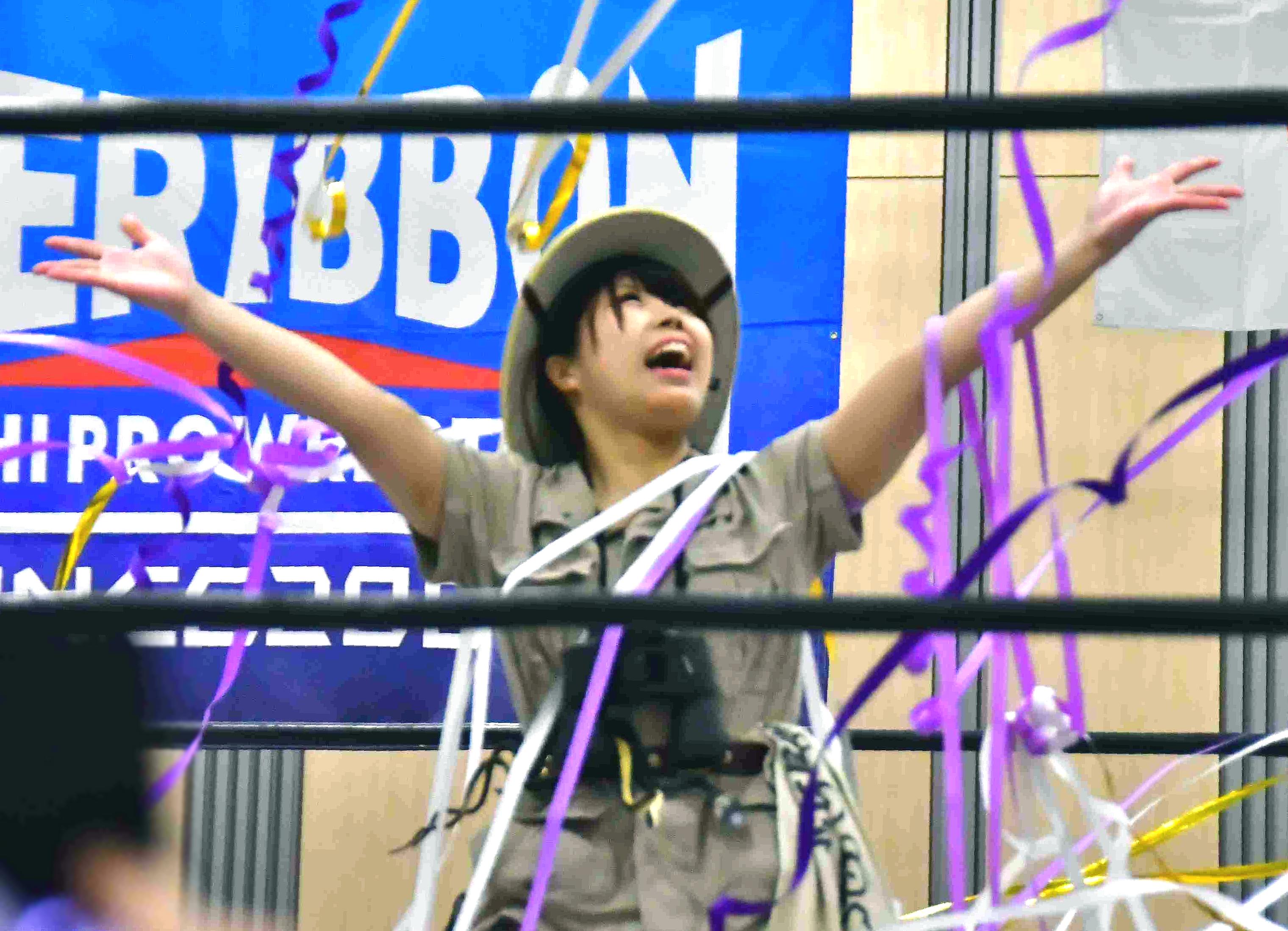 を破って権利を獲得すると、表彰式後にリングに上がった雪妃真矢からリボンタッグの